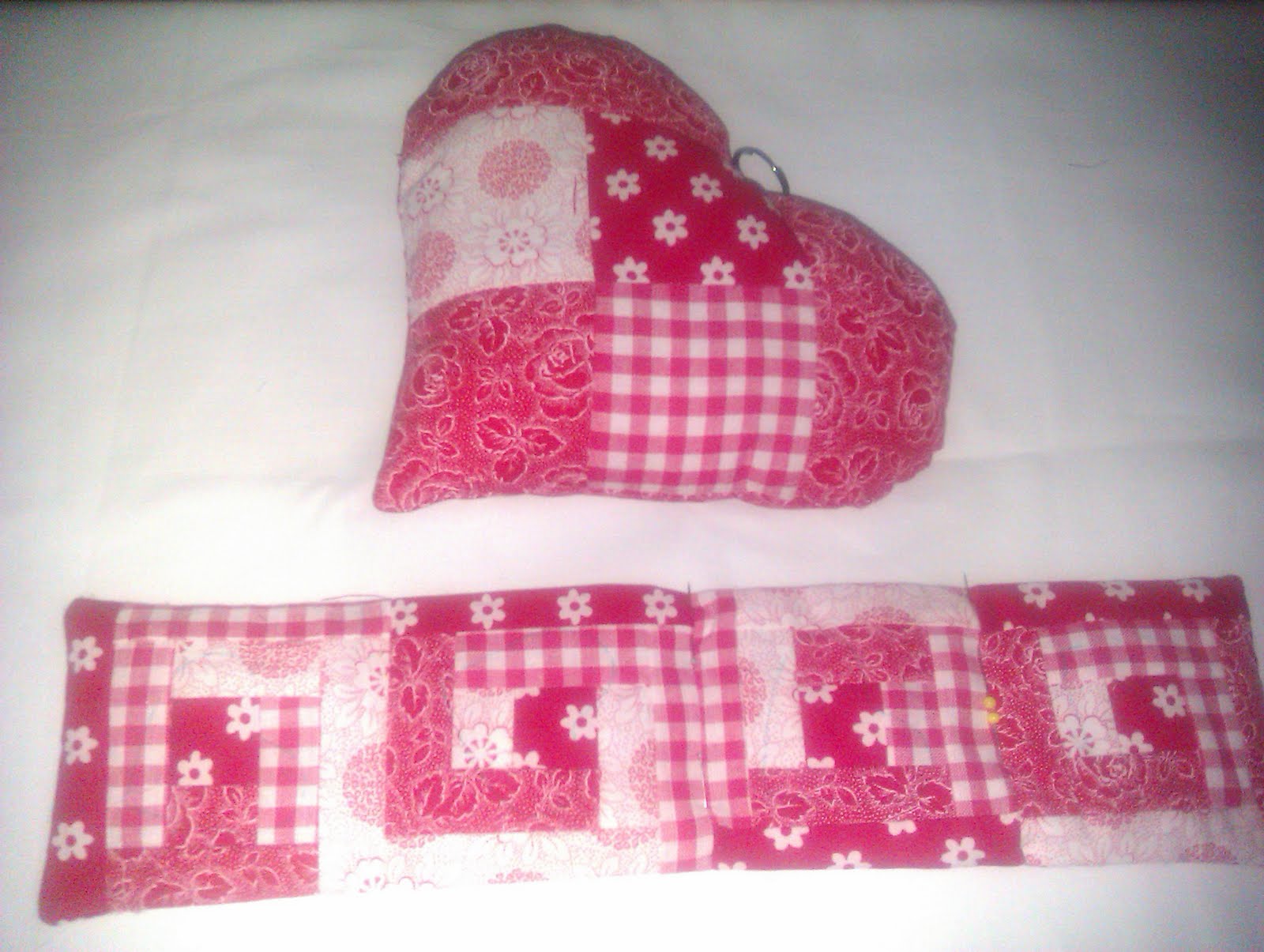 Een quilthart, hij moet nog opgevrolijkt worden. Er onder ligt nog een (htc)mobielhoesje klaar om in elkaar gezet te worden.